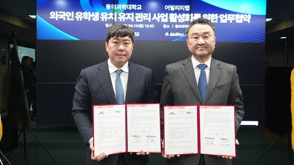 동의과학대학교와 ㈜어빌리티랩은 지난 14일 외국인 유학생의 체계적인 유치·유지·관리를 위한 전략적 업무협약(MOU)을 체결했다고 15일 밝혔다. 이번 협약은 학령인구 감소와 직업교육의 글로벌 경쟁력을 강화하기 위한 ‘K-Meister College 프로젝트’의 일환으로 추진되었다.